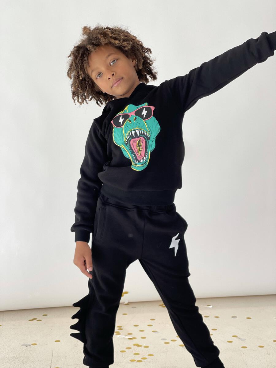Set o conjunto negro de sweater con capucha y joggers a juego con estampado de dinosauro, detalle en pant de rayo y cuernos de dino.
