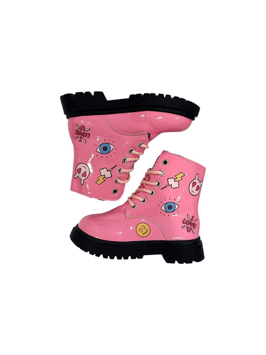 Botas de combate atrevidas y divertidas en rosa brillante, con divertidos gráficos de garabatos como caras sonrientes, relámpagos y corazones para una declaración única.