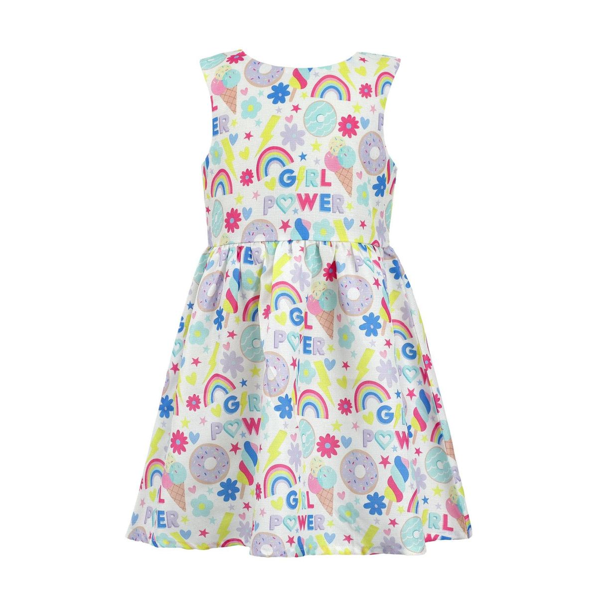 Combínalo con este vestido, que presenta un estampado divertido y vibrante de arcoíris, corazones y gráficos inspirados en el empoderamiento femenino.