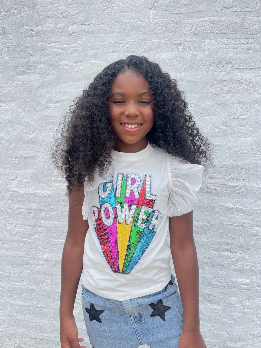 Empodera a tu pequeña con este top, con vibrantes letras de lentejuelas que forman la palabra "GIRL POWER" sobre un fondo de arcoíris.