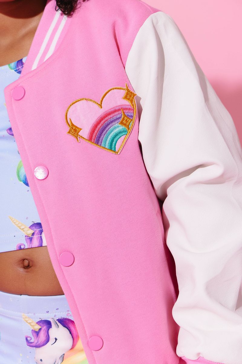 Llamativa chaqueta bomber jacket universitaria rosa y blanca con diseños vibrantes de arcoíris y relámpagos. Eslogan "Good Vibes Only" en la parte posterior para una declaración positiva y divertida. Cierre con botón a presión para un uso fácil y un ajuste cómodo.