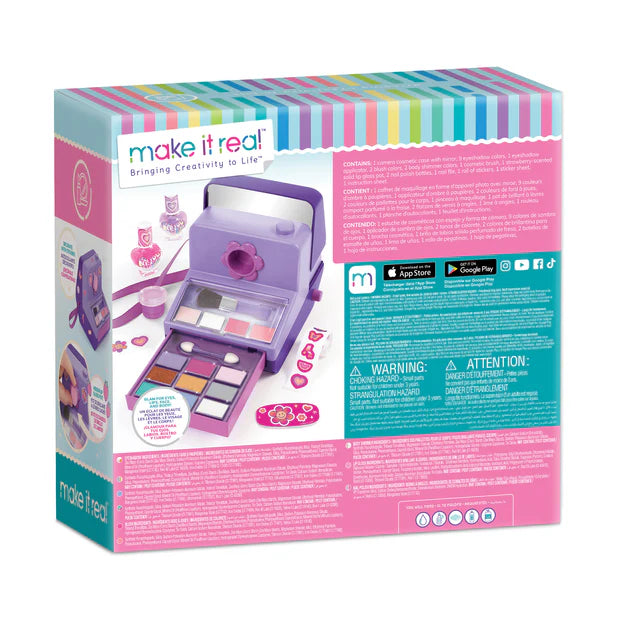 ¡Veamos qué apariencia de maquillaje se desarrolla cuando usas el estuche cosmético Instant Glam! Este estuche con forma de cámara viene completo con una variedad de maquillaje para lucir glamoroso de pies a cabeza, un espejo emergente, una lima de uñas y pegatinas súper lindas para decorar el estuche. Presione el botón para revelar más maquillaje en una bandeja emergente. Este juego incluye glamour para ojos, labios y uñas con 9 colores de sombras de ojos, 1 aplicador de sombras de ojos, 2 colores de rubor, 2 colores de brillo corporal, 1 brocha cosmética, 1 bote de brillo labial sólido con aroma a fresa, 2 botellas de esmalte de uñas y 1 lima de uñas. , 1 rollo de pegatinas, 1 hoja de pegatinas. El bote de brillo de labios se guarda hábilmente en la “lente” de la cámara. ¡Las preadolescentes se sentirán perfectas con una colección de maquillaje completa! Este juego es un gran regalo para preadolescentes en cualquier ocasión. Todos los cosméticos han sido sometidos a pruebas de seguridad para niños mayores de 8 años.