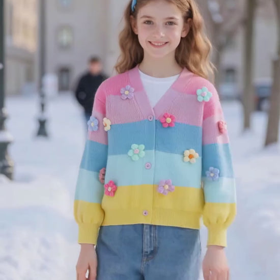 Cardigan multicolor en líneas horizontales con flores tejidas. Cuello en V y botones frontales en color rosa.