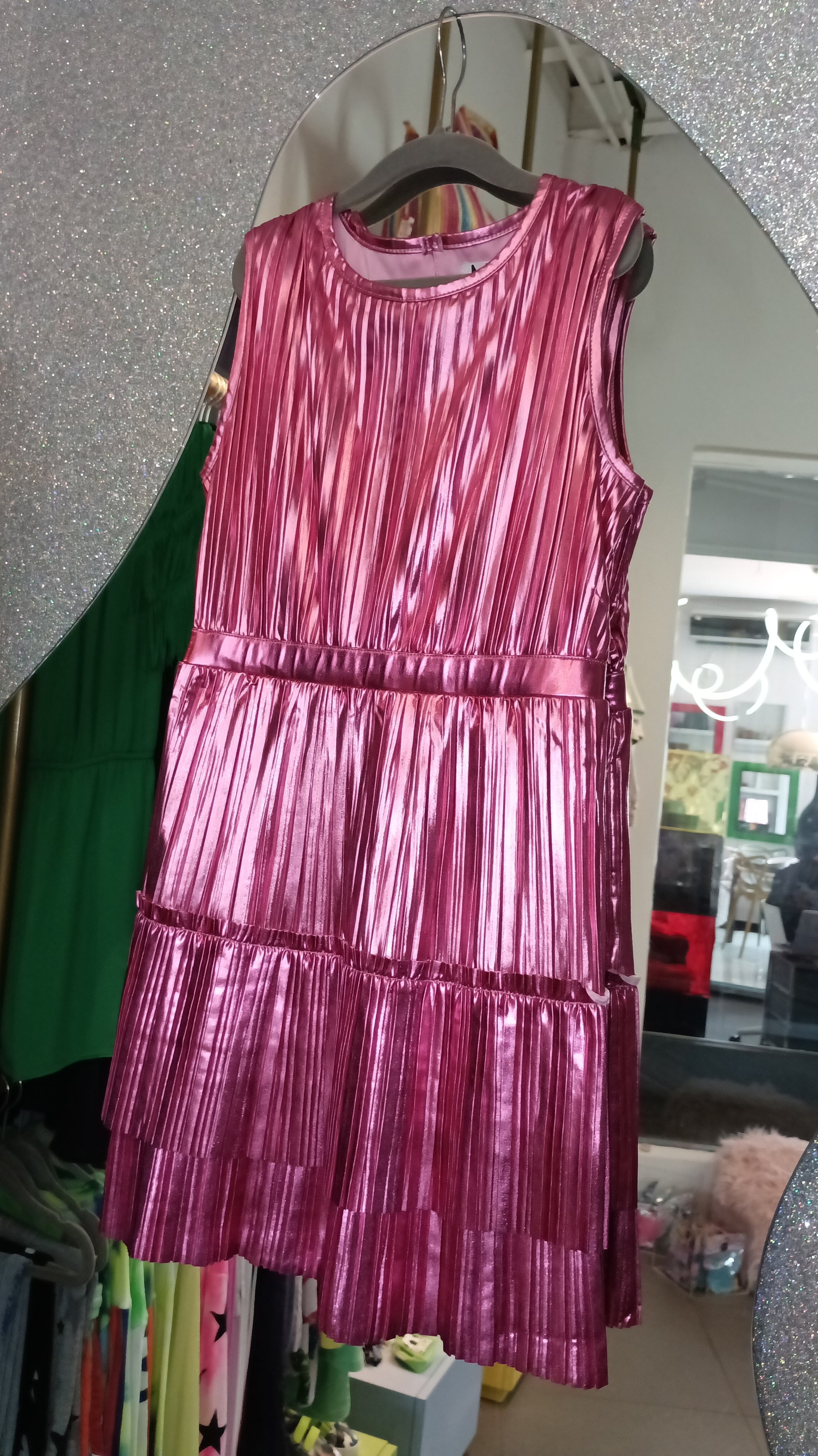 Vestido fucsia metalizado con ruffles, cuello en U.