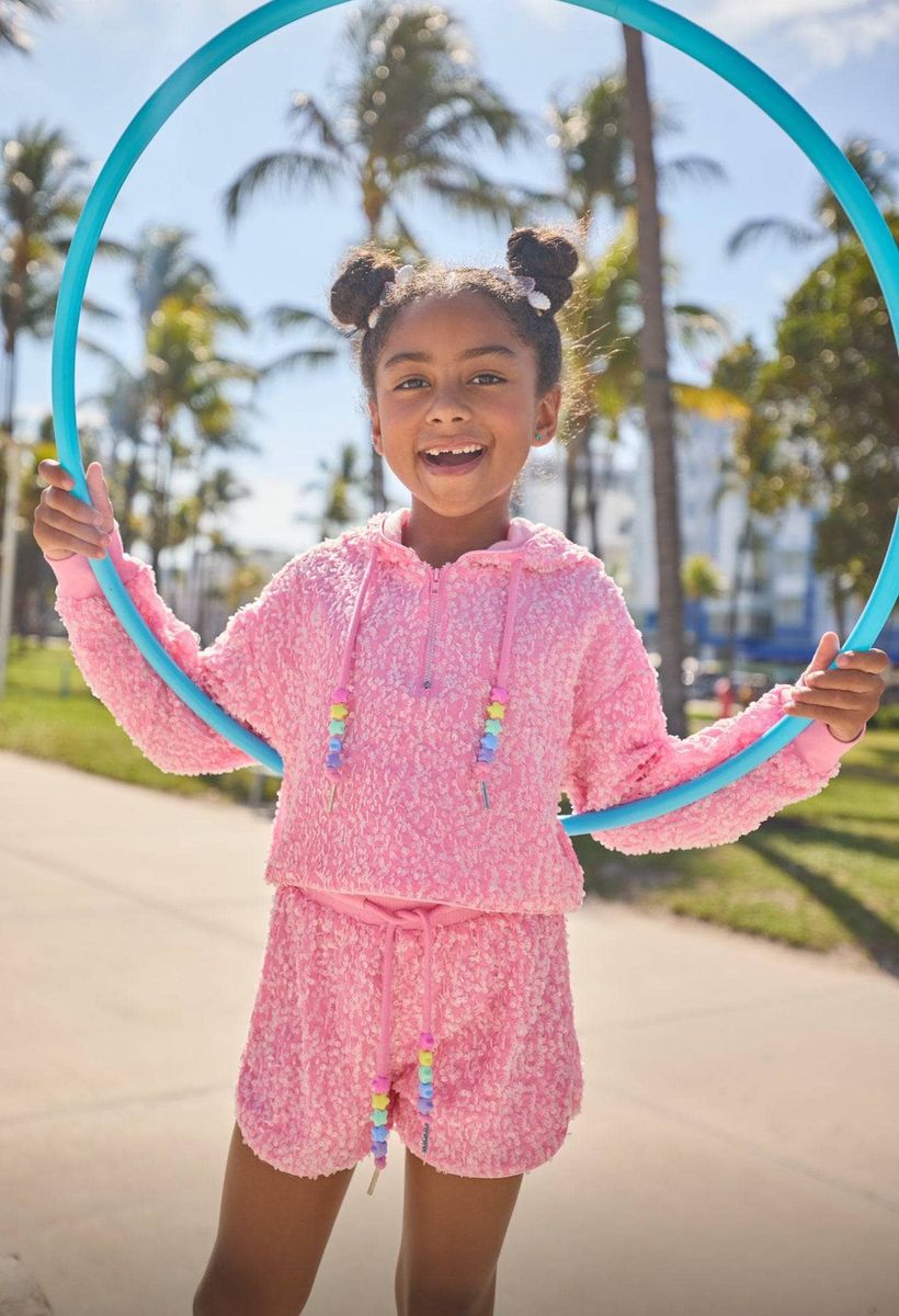 Brilla con estilo con este deslumbrante conjunto de sudadera con capucha y shorts de lentejuelas rosa, perfecto para añadir un toque de glamour a cualquier look.