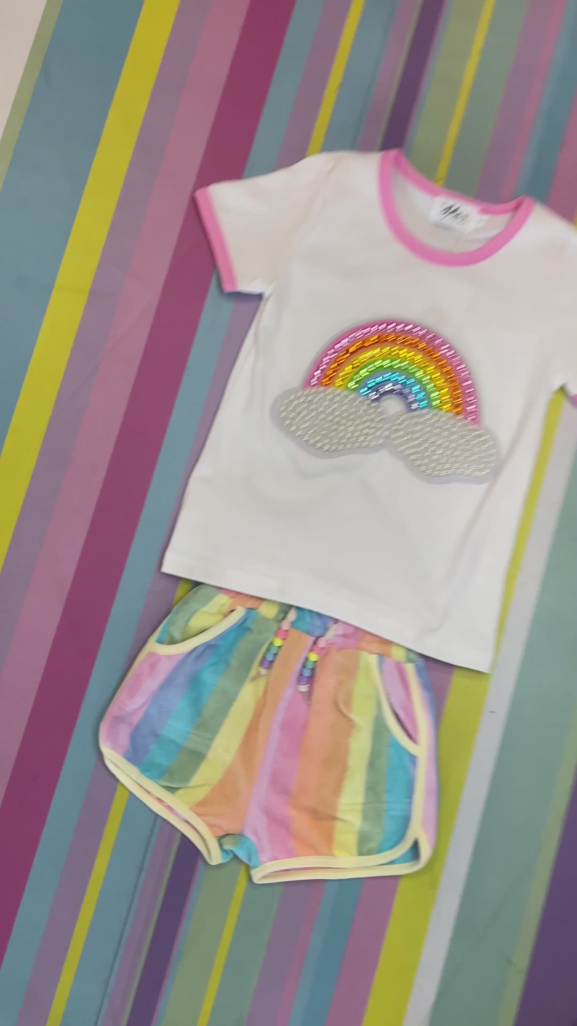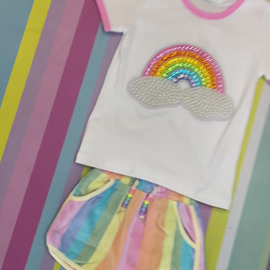 Esta encantadora camiseta presenta un arcoíris radiante adornado con pedrería de colores, creando un espectro de brillo que cautiva y deleita.