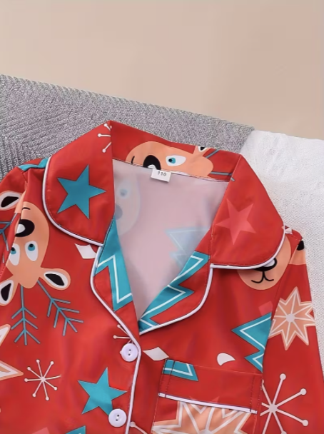 Pijama color rojo de camisa manga larga y pantalón con estampado de renos y árbol de Navidad. Cuello de solapa, detalles en bordes blancos y botones negros.