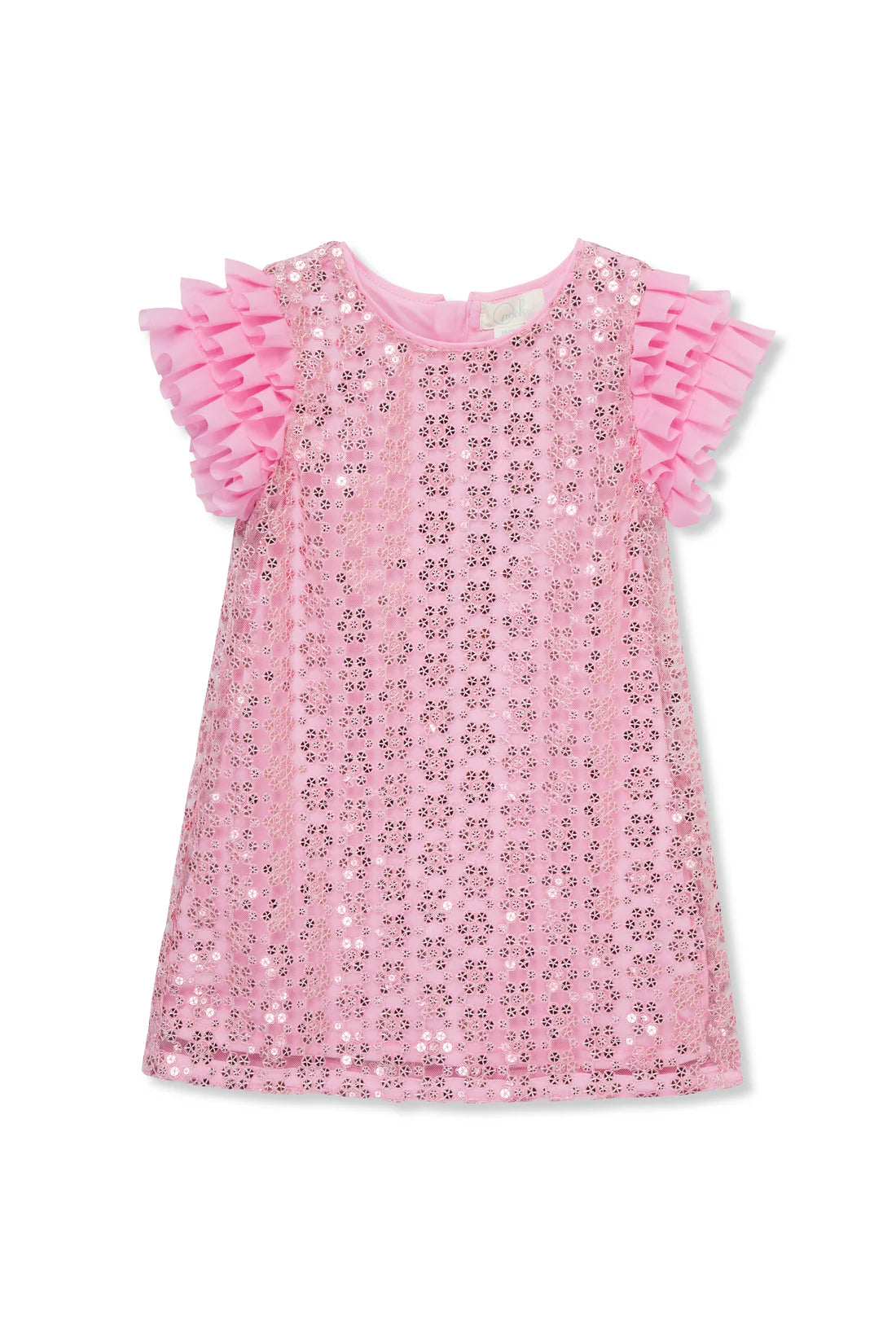 Este precioso vestido presenta detalles florales y de lentejuelas con mangas con volantes. ¡Perfecto para tu próxima ocasión especial!
