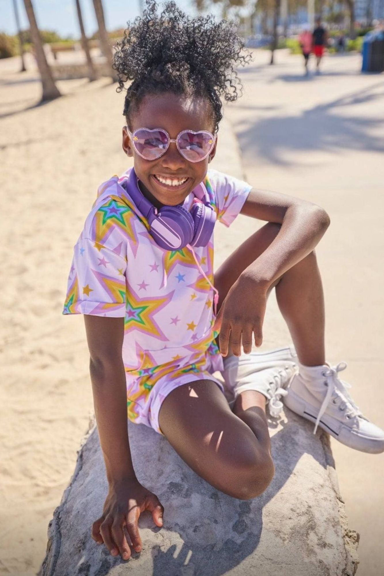 Conjunto vibrante de sudadera con capucha y pantalones cortos con un colorido estampado de estrellas, perfecto para días llenos de diversión.